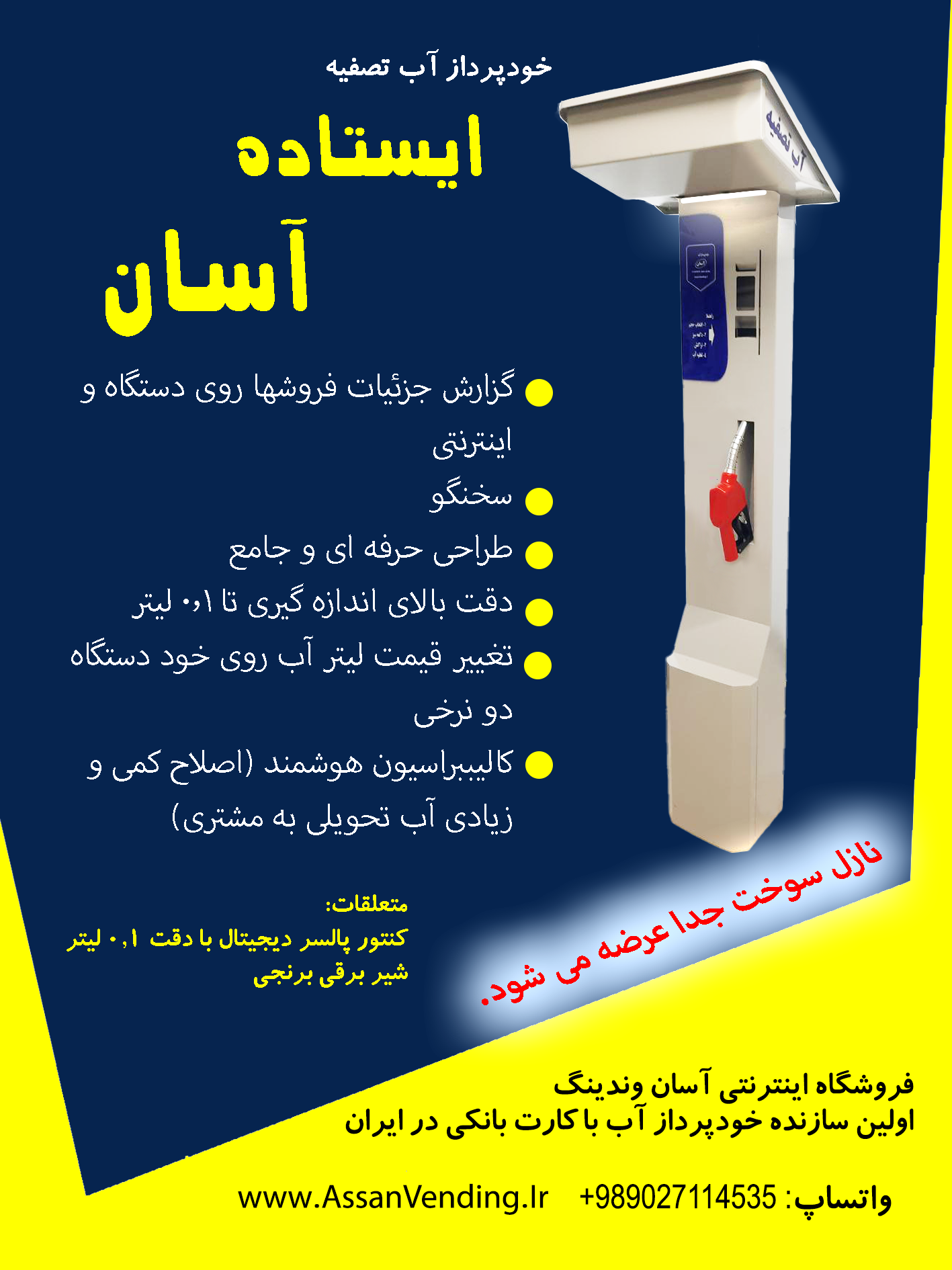 دستگاه های فروش خودکار یا عابر آب "آسان"با طراحی زیبا، ساده و پیشرفته، کمک دست 24 ساعته شما برای فروش آب و انواع سیالات می باشد. تمام عملیات بر روی کارت خوان انجام می شود و مشتری در هر مرحله به شکل مناسب راهنمایی می شود. به جرات می توان گفت این دستگاه ها پیشرفته ترین نوع دستگاه موجود کشور می باشد چرا که امکان گزارش گیری از عملکرد دستگاه، بر روی خود دستگاه و در فضای اینترنت وجود دارد. به لحاظ اقتصادی نیز، بسیار مقرون به صرفه می باشد.